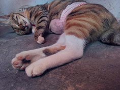术天第一天,为了保护它的伤口,又因为不肯戴圈,戴圈之后双脚要去弄出来,还在地上打滚,为了防止伤口裂开,只给它找了块布绑住,现在它倒是不反抗了,大概是知道我们是为了它好,也开始认人了。然后吃了一点,就睡睡睡,后来又起来喝水,看它能吃喝拉撒,也就放心了。但还是要照看着