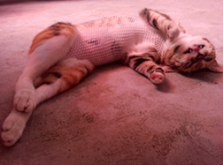 术天第一天,为了保护它的伤口,又因为不肯戴圈,戴圈之后双脚要去弄出来,还在地上打滚,为了防止伤口裂开,只给它找了块布绑住,现在它倒是不反抗了,大概是知道我们是为了它好,也开始认人了。然后吃了一点,就睡睡睡,后来又起来喝水,看它能吃喝拉撒,也就放心了。但还是要照看着